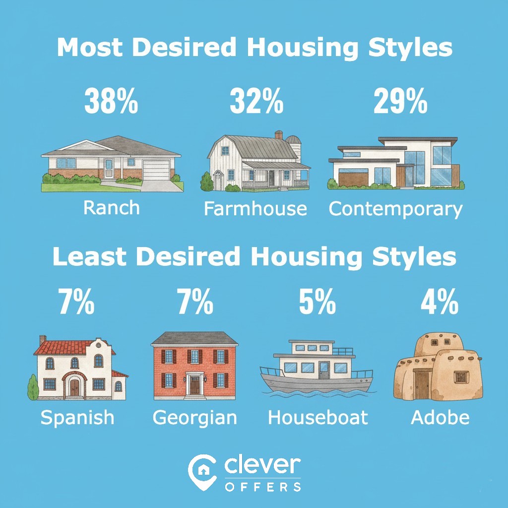 • Stylewise, one-story ranch homes (38%) are the most popular, followed by farmhouse-style properties (32%) and contemporary or modern homes (29%).