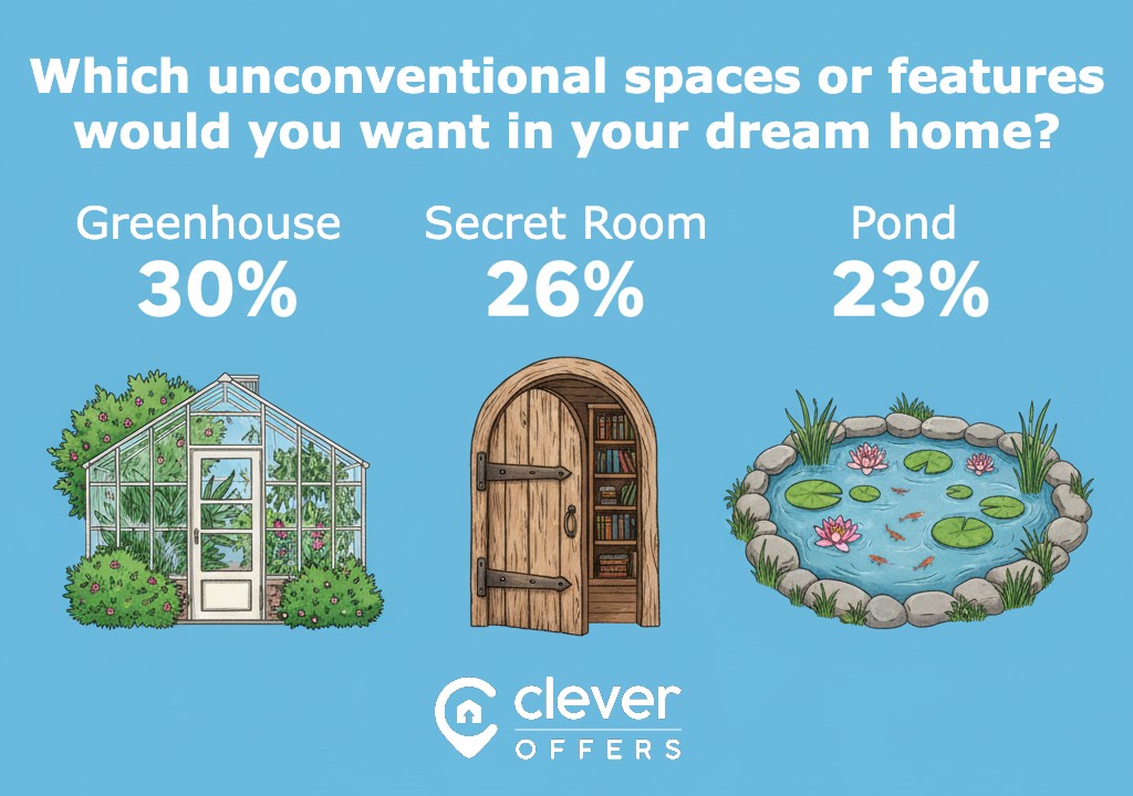 When considering a dream home, many Americans don’t feel the need to stick to purely functional or realistic spaces. About a third (30%) say they’d add a greenhouse, the most common unconventional dream home space. That’s followed by a secret room (26%) and a pond (23%).